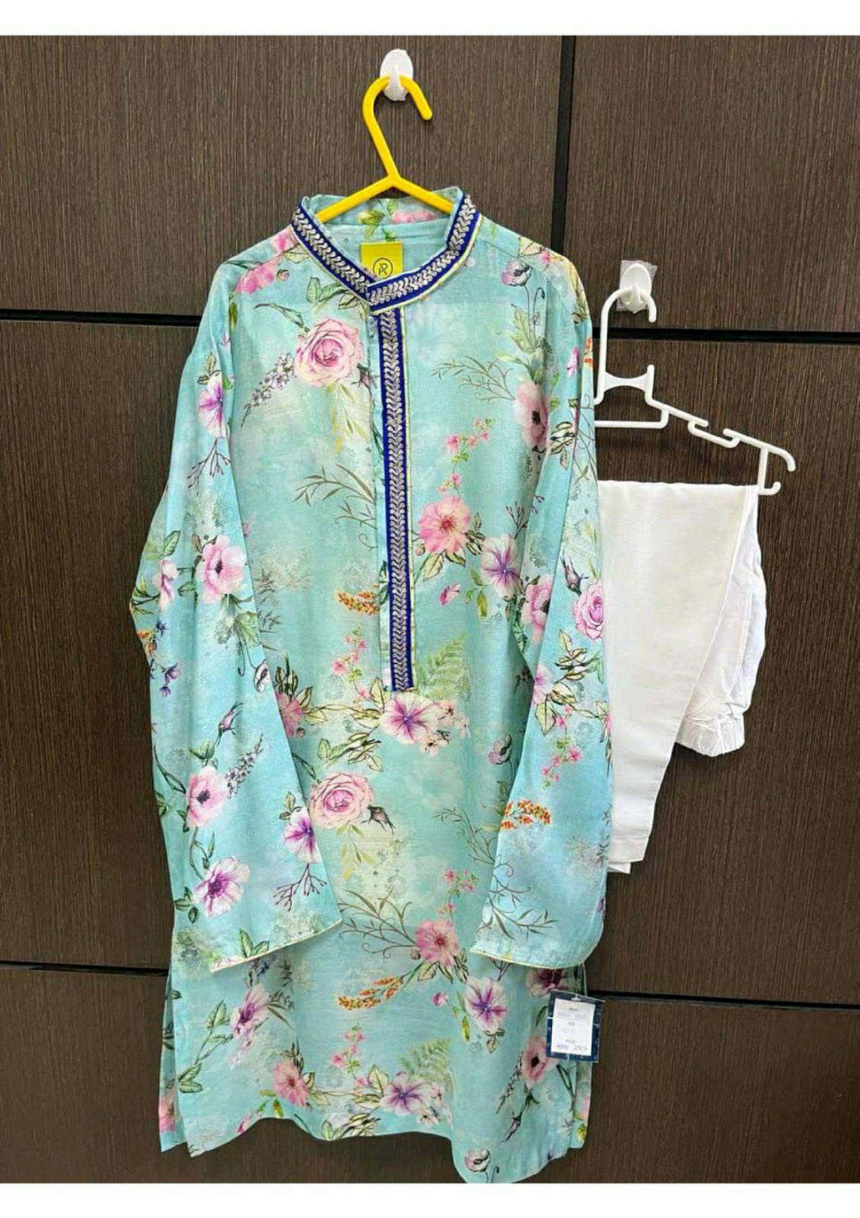 Blue floral printed kurta with blue lace and off white pant